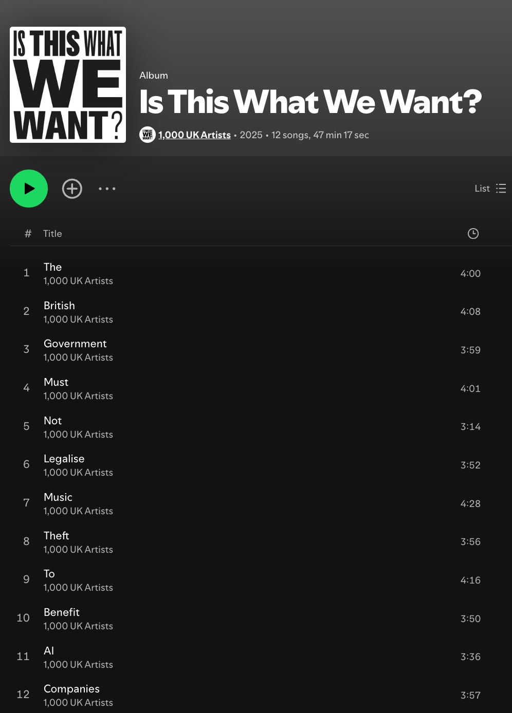 On February 25, over 1,000 artists released 'Is This What We Want?', a silent album in protest of planned changes to copyright AI laws planned by the UK government. An album of recordings of empty studios & performance spaces, it represents the effect the government proposals would have on musicians' livelihoods. The track list spells out a simple message: "The British Government Must Not Legalise Music Theft To Benefit AI Companies".