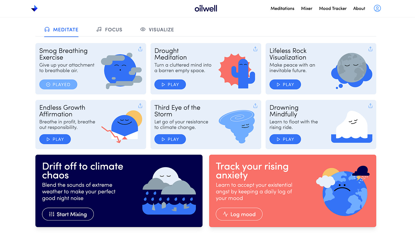 Oilwell is a brand new approach to wellness. Our meditations feature mindful moments that immerse you in extreme weather events, helping you learn to filter them out. While our mood tracker offers an online space where your feelings can be safely shared and ignored.