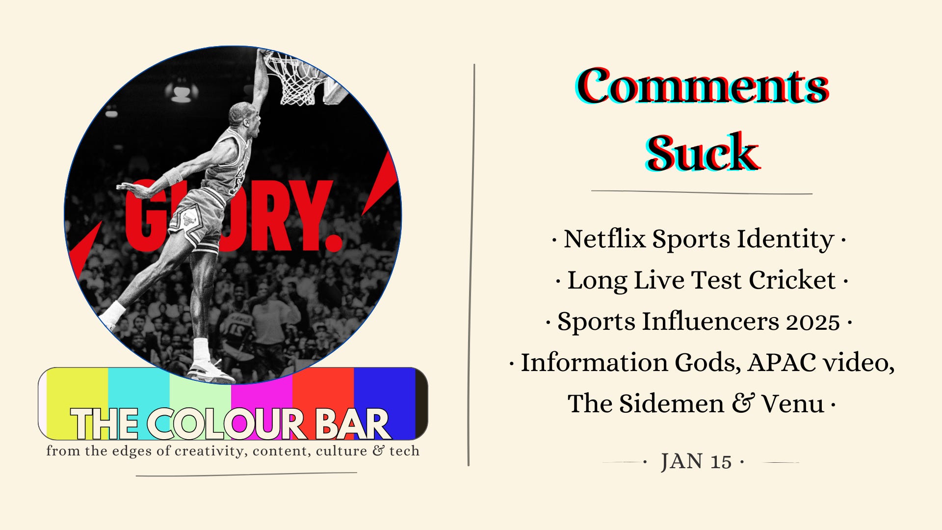The Colour Bar is where creativity, content, culture, tech, brands & humanity collide. This week, a sprinkling of sports across Netlfix, cricket, and the top movers in 2025. There’s a grand serving of Lamb, a call for awareness on Scams from the funnest kids magazine I know, smatterings on Monte Cristo and The Sidemen. Plus, quickies- video in APAC, one Piers Morgan, RIP Venu and our Information Gods.